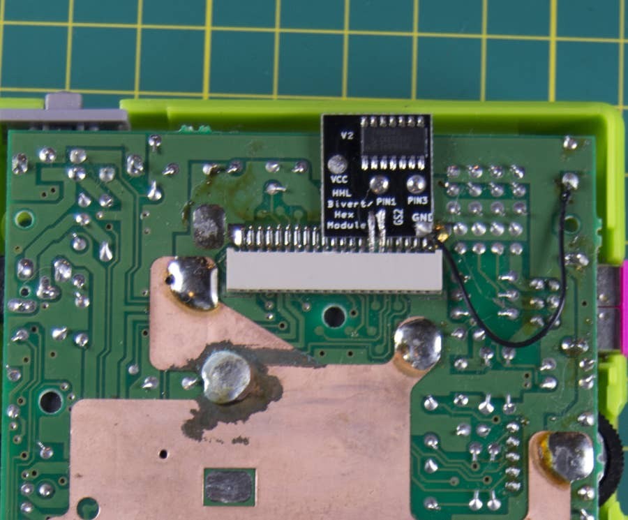 What does it do? The bivert chip essentially flips the values of what to make appear on the screen. The DMG-01 had values between 0-3, with 0 being a completely clear or "off" pixel, or 3 being completely dark or "on" pixel, with 1 and 2 being in between or shades of grey respectively. By flipping the bits it turns all the white space dark and all the dark space white, essentially inverting the image, which is then flipped back to normal depending on the orientation of the included polarizer film
