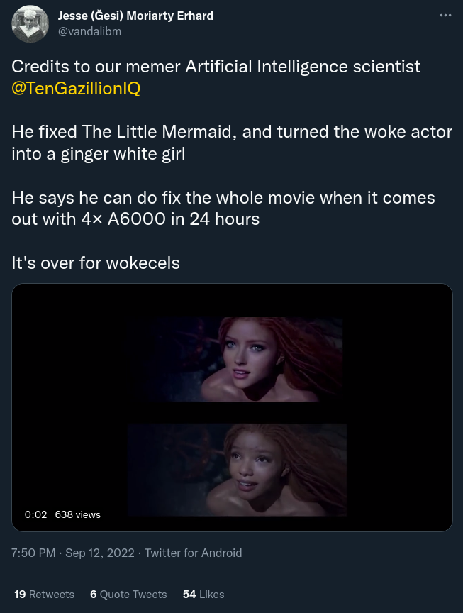 On the surface this is hilarious. All the woke scolds are seething right now because of AI being able to change the color of the little mermaid. But I think this is a very dangerous thing. Imagine a AI changing books, movies, videos, ect ect so well that you won't be able to tell the difference. Hell we can't even agree on the definition of the word woman, we sure as shit won't be able to figure out accurate history.